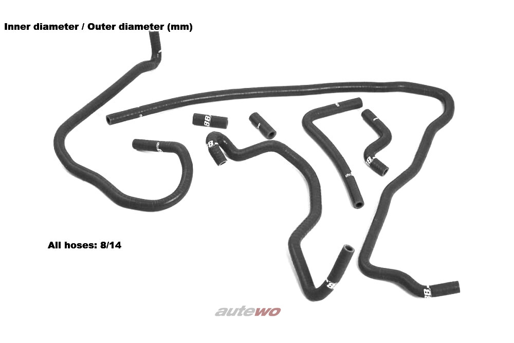 Audi S3 8L 1.8 Turbo 4 Zylinder 20V Turbo APY/AUL verstärktes Silikon-Unterdruckschlauchset mit entsprechend passenden, hochwertigen Schlauchklemmen aus rostfreiem Stahl Die Vorteile von Silikon-Schäuchen mit Gewebeinlagen liegen auf der Hand: 3-4 lagige Verstärkungen (je nach Innendurchmesser) und ca. 4-5mm Wandstärke führen zu einer höheren Haltbarkeit gegenüber originalen 1-lagigen Schläuchen. Die Schläuche sind von -30 Grad bis 200 Grad verwendbar und halten Drücken von bis zu 4 bar stand.