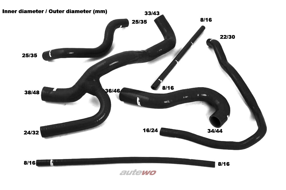 Audi Urquattro 10V 2.2l 5 Zylinder 10V Turbo WX/WR/GV verstärktes Silikon-Kühlwasserschlauchset mit entsprechend passenden, hochwertigen Schlauchklemmen aus rostfreiem Stahl Die Vorteile von Silikon-Schäuchen mit Gewebeinlagen liegen auf der Hand: 3-4 lagige Verstärkungen (je nach Innendurchmesser) und ca. 4-5mm Wandstärke führen zu einer höheren Haltbarkeit gegenüber originalen 1-lagigen Schläuchen. Die Schläuche sind von -30 Grad bis 200 Grad verwendbar und halten Drücken von bis zu 4 bar stand.