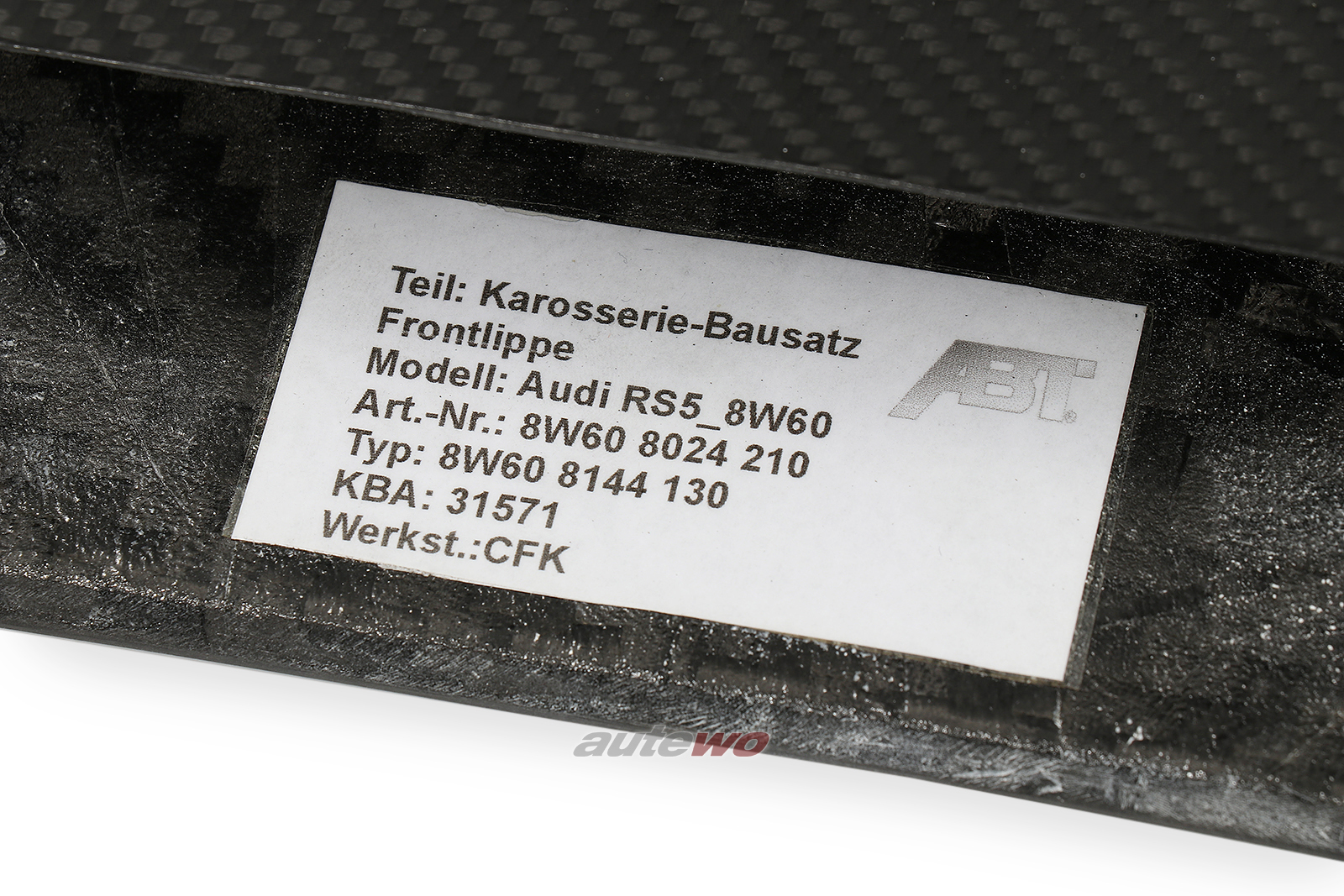 Audi RS5-R 8W original ABT Sportsline Frontlippe 8W608024210 in Sichtcarbon GlanzMaterial: Kohlefaserverstärkter Kunststoff (CFK)------------------------------------------ABE-Nr.: 31571 ------------------------------------------Verwendungsbereich:Audi RS5_8W60 (Coupé, NF, MJ 2018)ABT Audi RS5-R_8W60 (Coupé, NF, ABT, MJ 2018)Audi RS5_8W60 (Sportback, NF, MJ 2019)ABT Audi RS5-R_8W60 (Sportback, NF, ABT, MJ 2019)