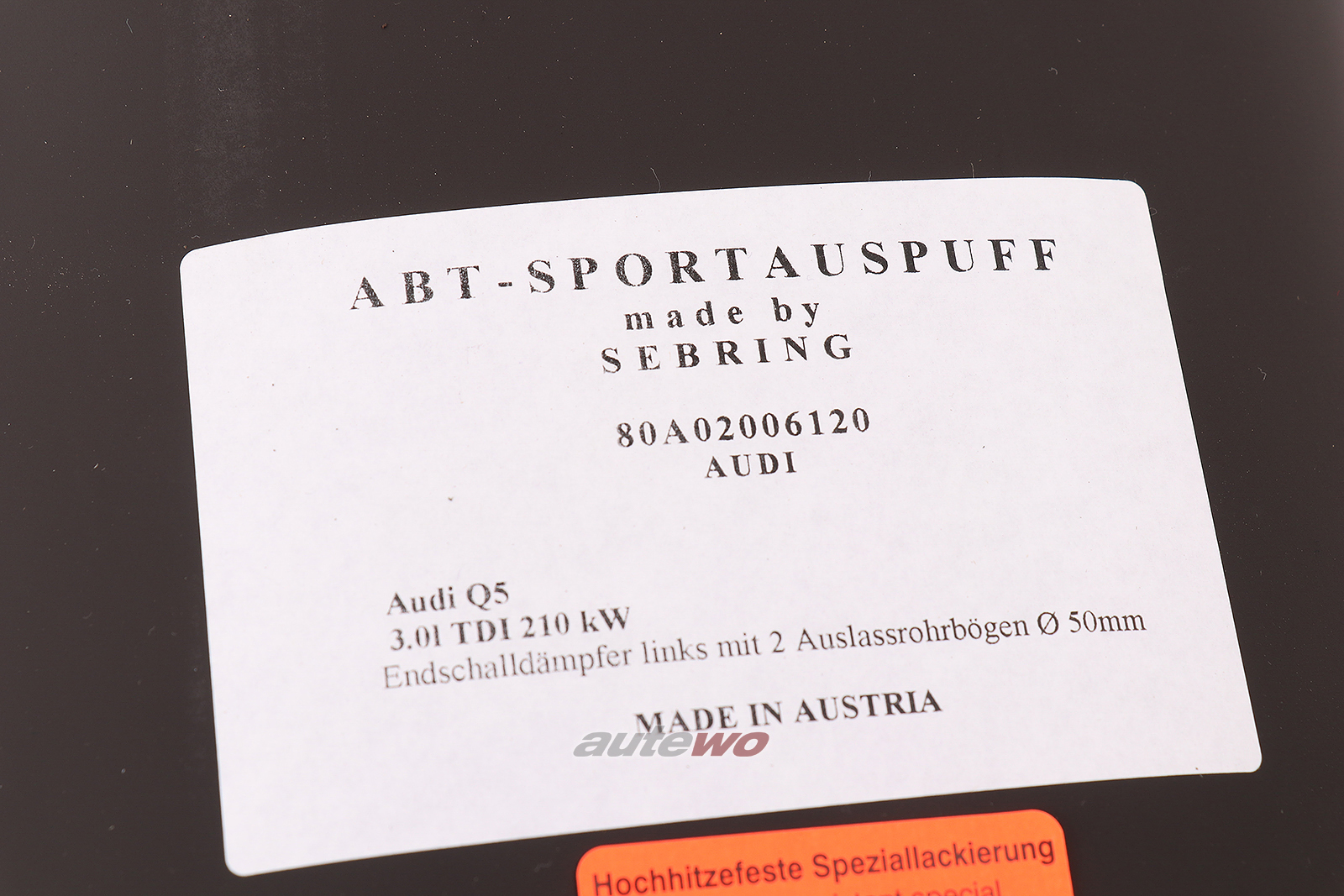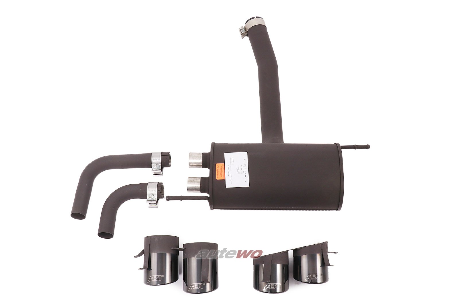 Hinweis: Die Abgasanlage ist ursprünglich für den ABT Diffusor 80A08006130 konzipiert und hat auch nur in Verbindung damit eine Zulassung. Ob und wie der Artikel an einen Serien-Diffusor verbaut werden kann, ist unklar! --------------------------------------------------------------- EG-Genehmigungs Nr: e4*540/2014*540/2014A*0065*01 Schalldämpfertyp: 1717 --------------------------------------------------------------- Lieferumfang: - ABT-Endschalldämpfer links, mit 2 Auslassrohrbögen Durchmesser 50mm, inkl. 2 Haltern - ABT-Endrohrblende links; heckintegriert mit je 2 Endrohren Durchmesser 102 mm, inkl. Innenrohre, mit 4 angeschweißten, gekanteten Halteblechen, durchströmt - ABT-Endrohrblende rechts; heckintegriert, mit je 2 Endrohren Durchmesser 102 mm, inkl. Innenrohre, mit 4 angeschweißten, gekanteten Halteblechen, nicht durchströmt - Montagematerial (1x Rohrschelle Ø80mm, 2x Rohrschelle Durchmesser 55mm) - Montagematerial - Produkthinweisblatt - Montageanleitung; (per Download) - EG-Genehmigung; (per Download)